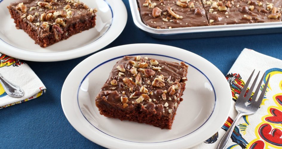 Tory Avey describe this as Rich, Moist Chocolate Sheet Cake Topped with Chocolate Frosting and Toasted Pecans. Tried-and-True, Quintessential Texas Dessert Recipe. Cake Ingredients 2 cups all-purpose flour 2 cups sugar 1 tsp baking soda 1 tsp kosher salt 1 cup (2 sticks) butter 1 cup water 1/3 cup cocoa powder 1 cup sour cream 2 eggs 1 tsp vanilla Frosting Ingredients 1/2 cup (1 stick) butter, melted 1/3 cup milk 1/4 cup cocoa powder 1 box (16 ounces or 1 lb) powdered sugar 1 tbsp vanilla 1 cup chopped pecans, toasted (optional) You will also need 13-inch x 18-inch x 1-inch jelly roll pan, nonstick cooking spray, mixing bowls, medium saucepan Get the directions on how