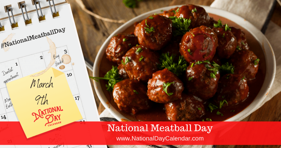 Who can resist the idea of celebrating National Meatball Day? There are many different ways to celebrate meatballs: Spaghetti and meatballs Swedish Meatballs Meatball Sub Meatball Pizza Try this Meatball Recipe below. The main ingredients are: 1 cup Panko breadcrumbs1/3 cup milk1 pound ground beef1 pound ground pork4 cloves garlic, pressed or minced2 eggs1 cup (1 1/2 ounces) finely-grated Parmesan cheese See this recipe link for the rest of the ingredients and cooking instructions: