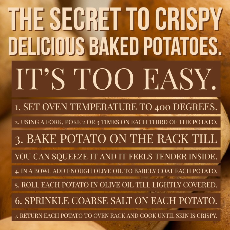 Have you ever wanted to bake crispy skinned potatoes like they do in the restaurants? I did too.  I searched for recipes on how to do it and I found that they were one step off. They added the olive oil before they cooked them. Try cooking them and then adding the olive oil. You will end up with a much crispier skin.  What tricks have you learned about baking potatoes? Please comment and let us know.  We appreciate your experience.