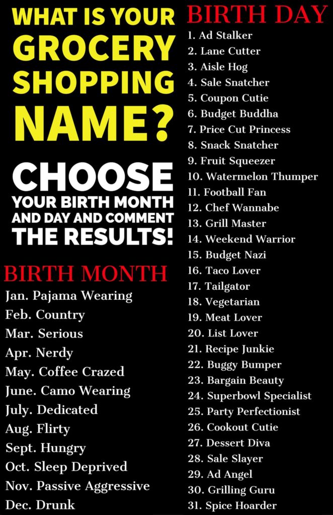Choose your BIRTH MONTH and your BIRTH DAY and COMMENT your Grocery Shopping Name!