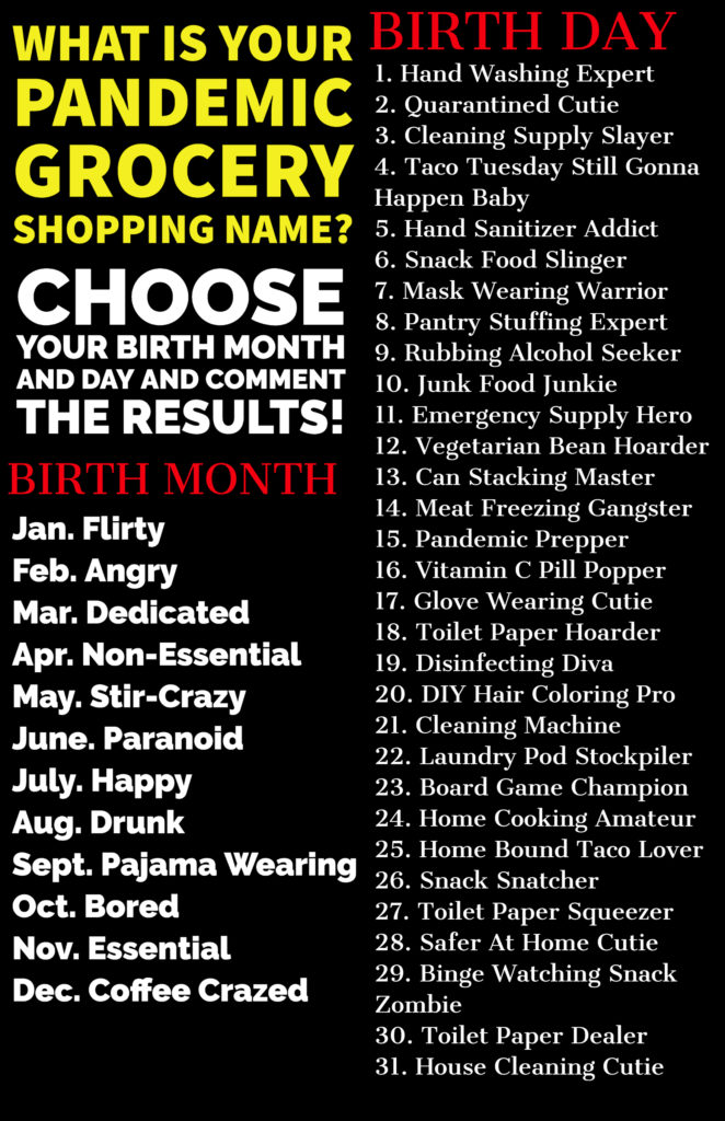 Choose your BIRTH MONTH and your BIRTH DAY and COMMENT your Pandemic Grocery Shopping Name!